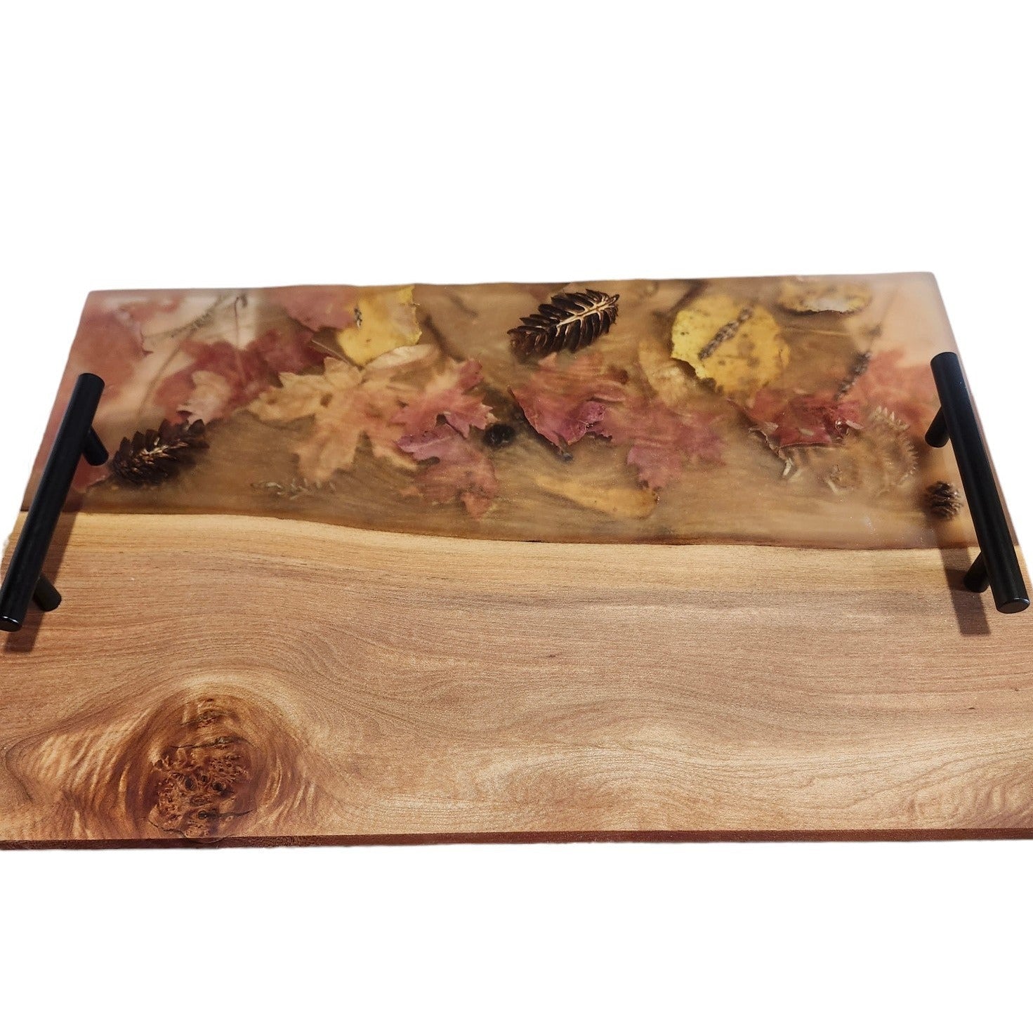 The resin portion is made by hand pouring swirled resin around the decor and in a mold with the live edge wood pieces. This is a meticulous craft that combines artistry and precision.