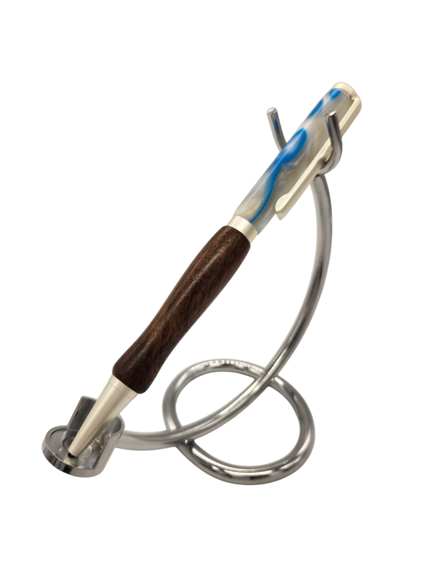 Crafted from various premium woods, the front parts of our pens exude timeless sophistication. Meanwhile, the back parts feature swirly light blue and white acrylic, creating a dynamic and eye-catching design. Held together with slimline hardware, these pens boast sophistication and durability.