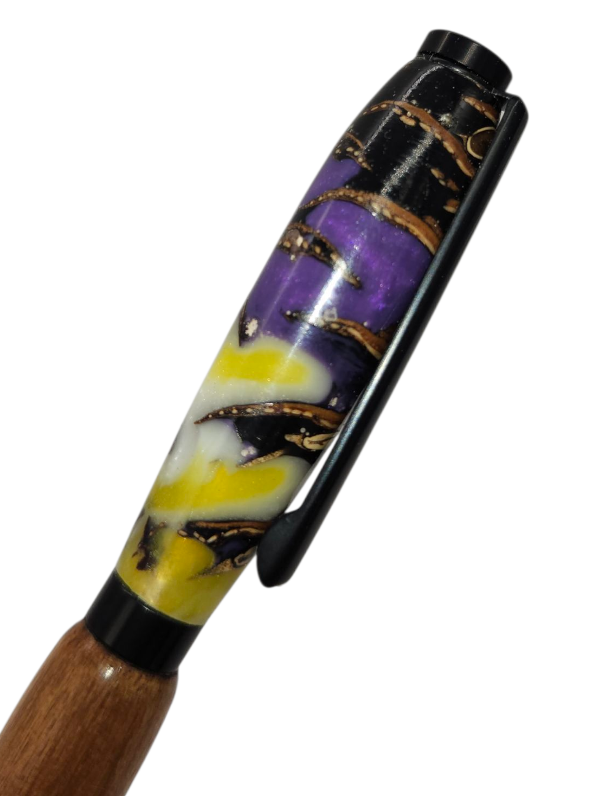 - The resin portion of the pen is made by hand pouring resin into a pen blank and then hand-turning to create a smooth finish. This is a meticulous craft that combines artistry and precision.