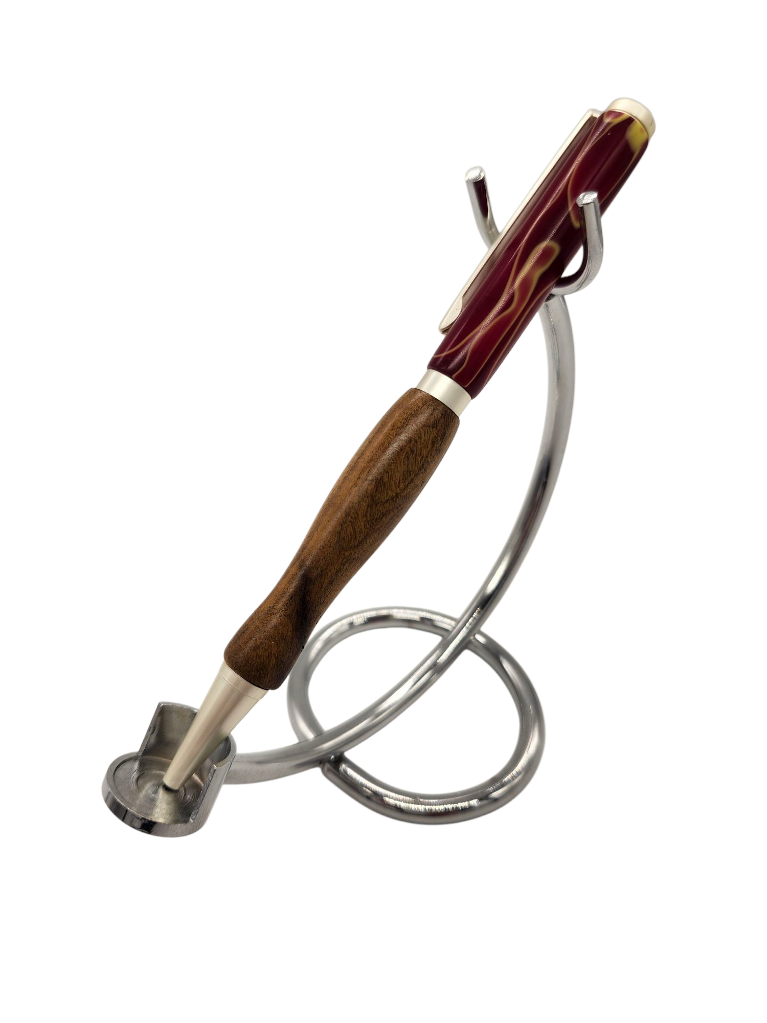 Crafted from various premium woods, the front parts of our pens exude timeless sophistication. Meanwhile, the back parts feature swirly pomegranate red acrylic, creating a dynamic and eye-catching design. Held together with slimline hardware, these pens boast sophistication and durability.