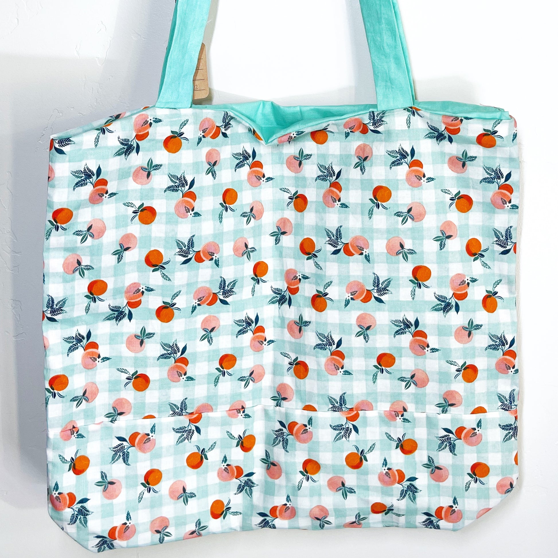 This Summer Peach Tote Bag features adorable peaches on a spring green gingham background which matches the solid spring green straps and inside. It is perfect for spring and summer, or to bring a taste of summer to the winter.