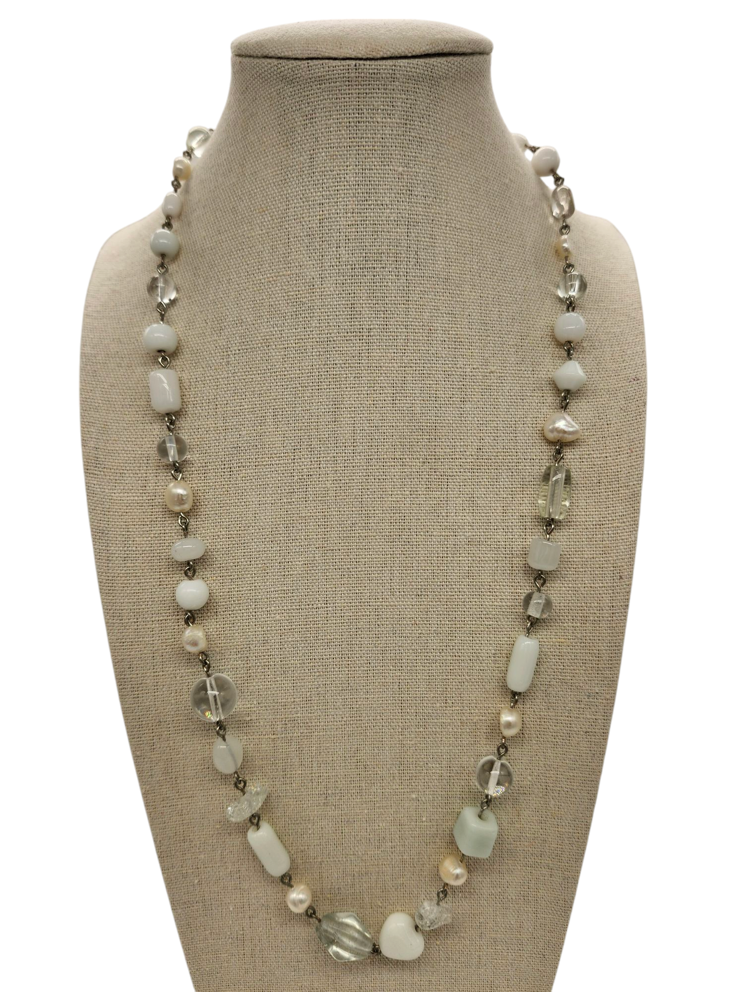 Elevate your style with our White Pearl Tone Clutter Necklace. This is a one of a kind piece handmade from white glass beads complemented by pearlescent and clear beads. It is made with stainless steel wire to provide long lasting durability. This accessory is simple and elegant, pairing perfectly with a variety of aesthetics and occasions.