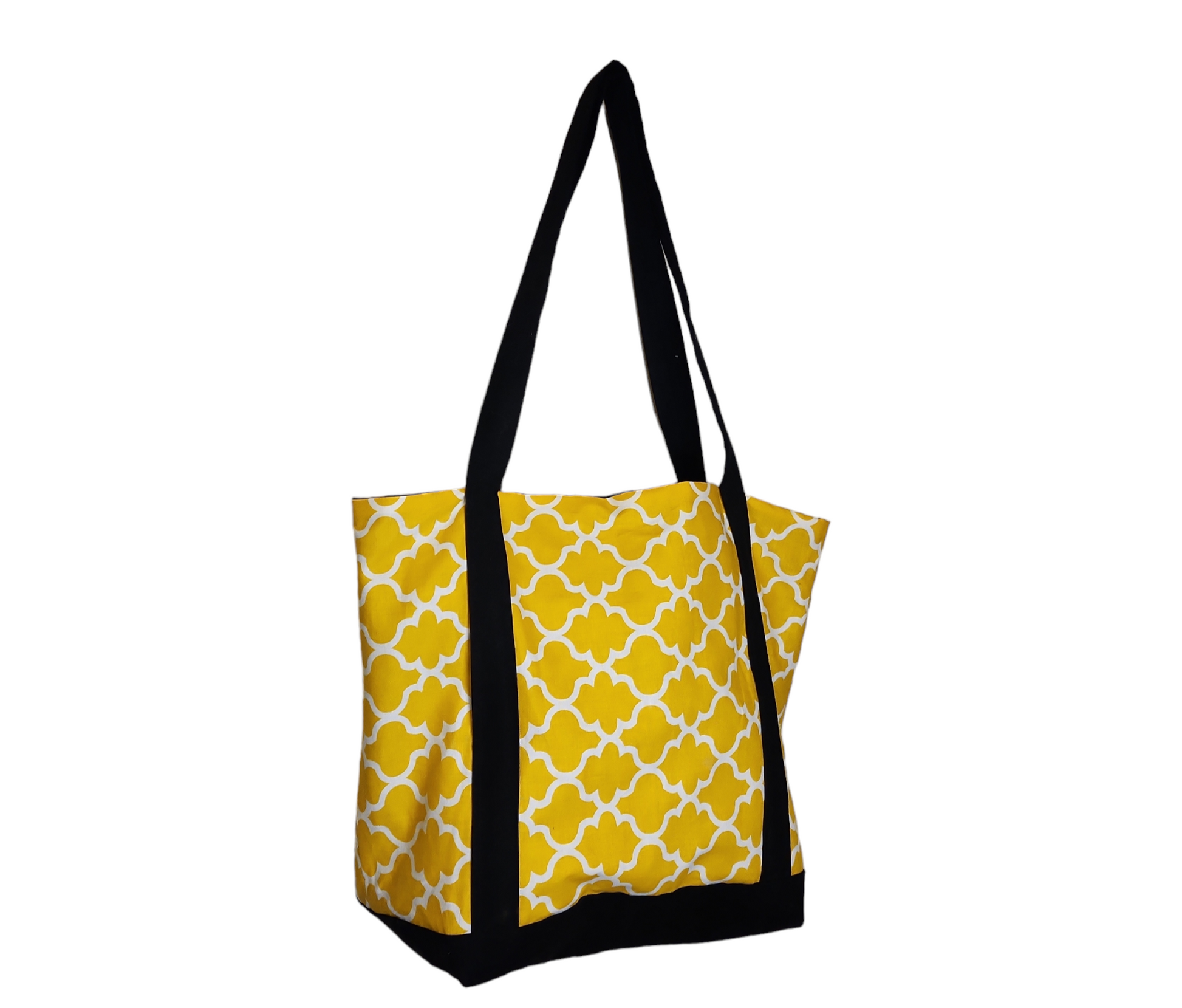 Our Yellow and Black Tote Bag will help you effortlessly carry all your essentials in style. This bag features a yellow quatrefoil design which is complemented by the black fabric used for the straps, bottom, and inside.